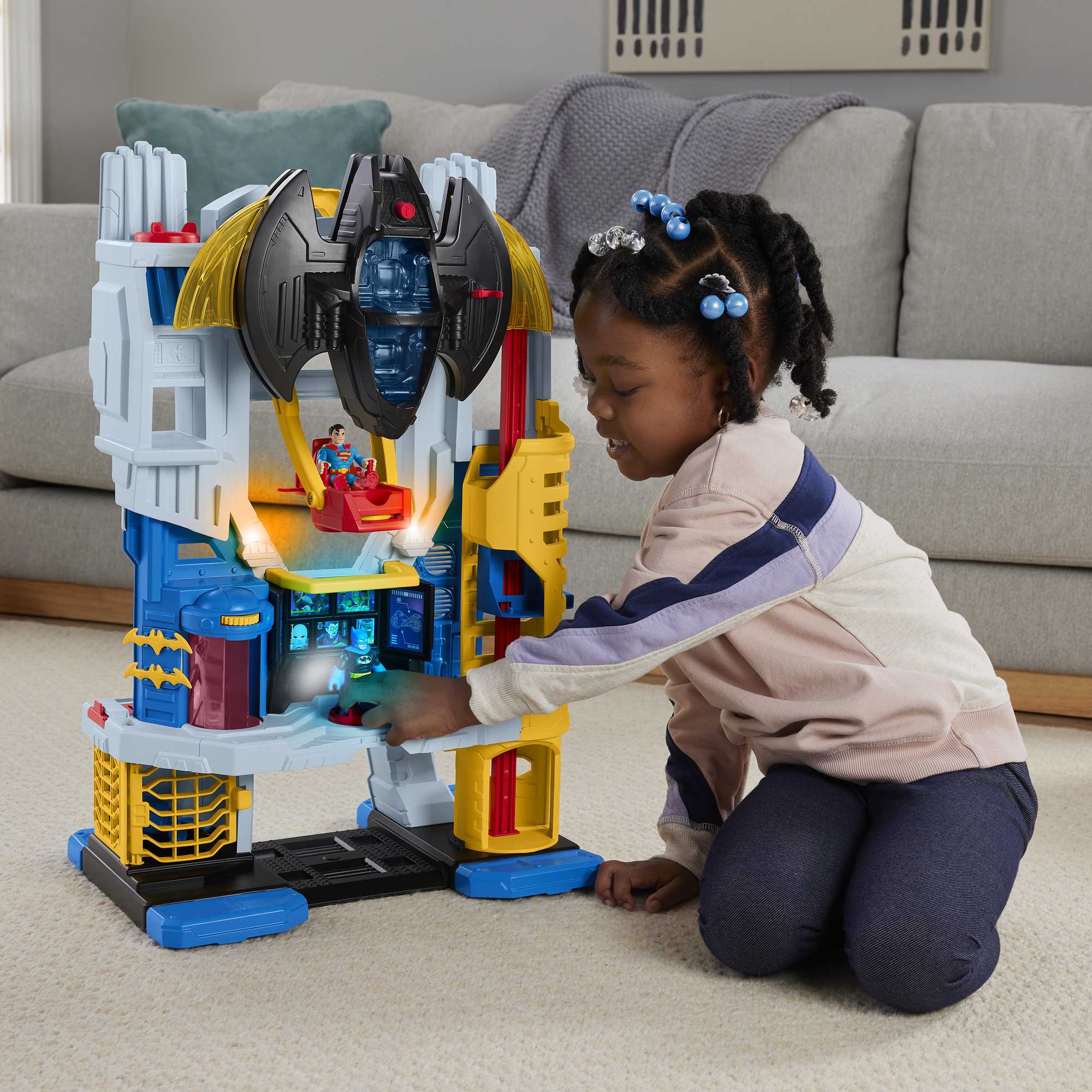 Les enfants peuvent imaginer des aventures épiques avec les super-héros de la Ligue des Justiciers grâce à ce coffret Imaginext® DC Super Friends Quartier Général de Fisher-Price®. Ce quartier général de 60cm de haut comprend 4niveaux de jeu que les apprentis justiciers prendront plaisir à explorer, des lumières et des sons immersifs, un lance-projectile caché et une cellule de prison, ainsi qu’un Batplane transformable et un Batcycle à faire rouler. Les enfants vont adorer envoyer Batman et Superman en mission pour vaincre les méchants à chaque nouvelle menace.